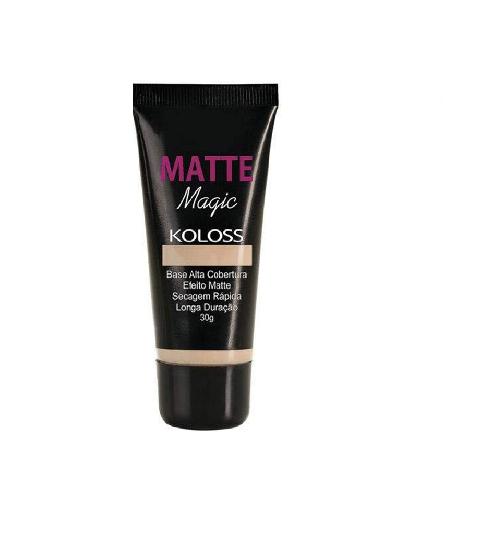 Base matte magic Koloss tem uma super cobertura e um incrível efeito mate ,opaco, essa base, de fácil aplicação, proporciona um acabamento perfeito, com secagem rápida e longa duração. Reduz a aparência dos poros e linhas finas de expressão.