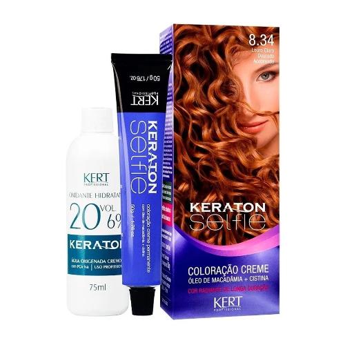 A Coloração Kert Keraton Selfie 8.34 Louro Claro Dourado Acobreado promove uma cobertura impecável dos cabelos. Sua fórmula contém macadâmia, ômega 3, ômega 7 e cistina. Proporciona proteção, hidratação, além de deixar os fios macios e brilhantes.