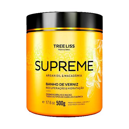 O Creme Banho de Verniz Tree Liss Supreme 500g é indicado para recuperar e hidratar os fios, promovendo brilho intenso com efeito de verniz. Sua fórmula é enriquecida com óleo de argan e macadâmia, que deixam os cabelos hidratados, macios e livre de danos. Ideal para uso em todos os tipos de cabelo.