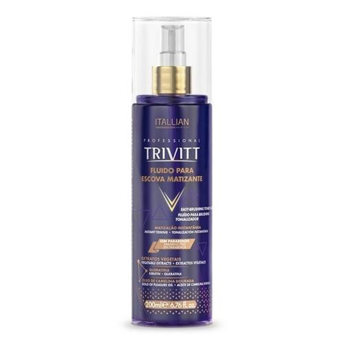 O Fluído Para Escova Itallian Hairtech Trivitt Matizante 200ml é indicado para cabelos louros. Sua fórmula possui extratos vegetais, queratina, óleo de camelina dourada e silicone. Proporciona matização instantânea, hidratação e revitalização dos fios.