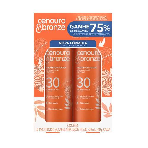 O Kit Protetor Solar Aerosol Cenoura & Bronze FPS 30 contém 2 unidades de 200ml, oferecendo proteção prática e eficaz contra os raios UVA e UVB. Sua fórmula em spray contínuo garante aplicação uniforme, toque seco e textura ultraleve, facilitando o uso, inclusive de cabeça para baixo. Enriquecido com ativos da cenoura e vitamina E, mantém a pele hidratada, protegida e com um bronzeado mais bonito e duradouro.