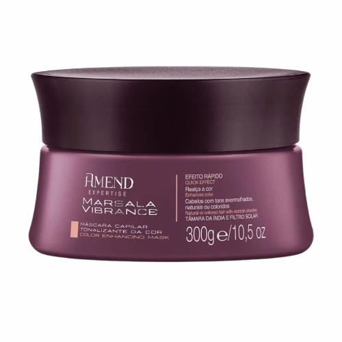 A Máscara Amend Marsala Vibrance 300g é indicada para cabelos naturais ou coloridos com tom avermelhado. Sua fórmula possui Tâmara da Índia e filtro solar, que realçam a cor, evitam o desbotamento, promovem brilho intenso e maciez.