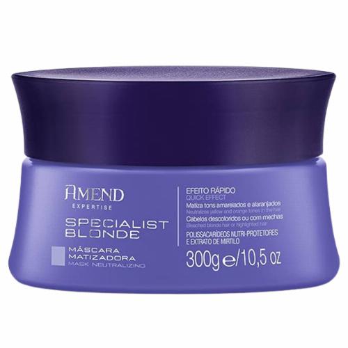 A Máscara Amend Matizadora Specialist Blonde 300g é indicada para cabelos descoloridos ou com mechas. Possui polissacarídeos nutri-protetores e extrato de mirtilo, que promovem uma neutralização dos tons amarelados e alaranjados, além de uma reconstrução profunda dos fios.