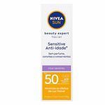 NIVEA SUN Beauty Exper Facial Sensitive FPS 50 é um protetor solar que possui fórmula especialmente desenvolvida para peles sensíveis pois não possui perfumes, corantes e conservantes, evitando irritações no rosto. Com um sistema de filtro UVA/UVB que oferece alta proteção imediata, previne o envelhecimento da pele* e protege contra os danos causados pelos raios solares.